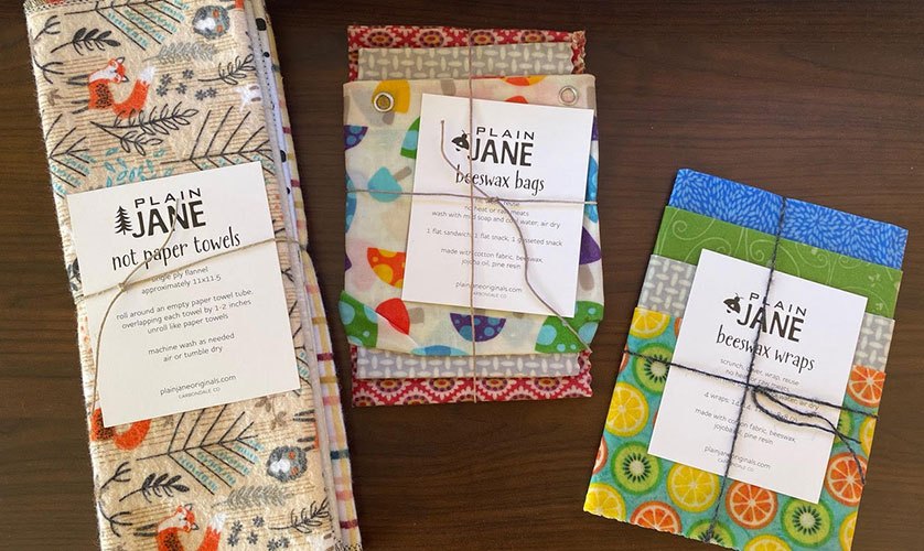 Plain Jane Originals took root when long-time urbanite Jane Mason moved from the San Francisco Bay Area to the Western Slope of Colorado and discovered she really likes making things. Her combined passions for thrifting/upcycling, using less plastic, and being in the woods let her to create usable green goods that she sells on a small scale.